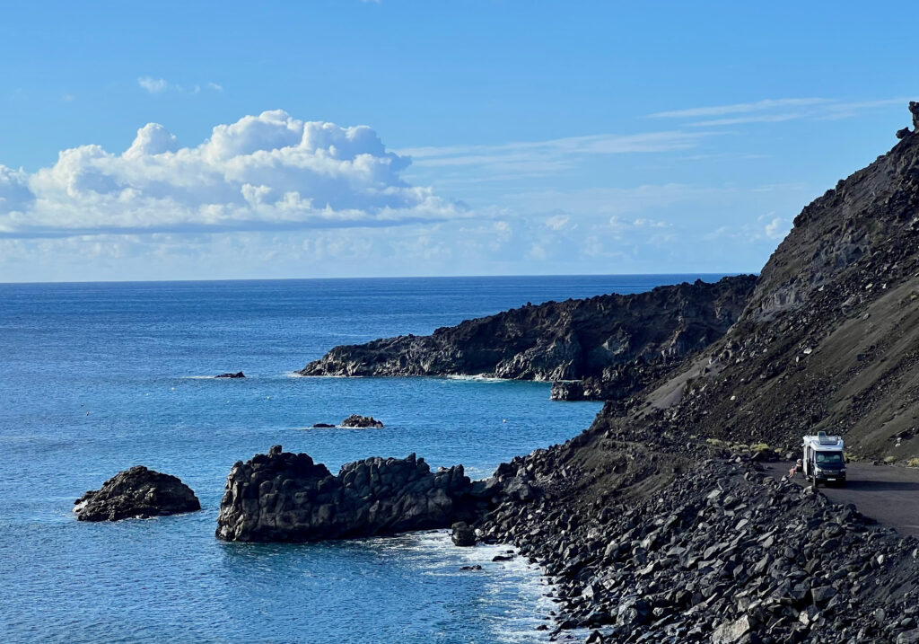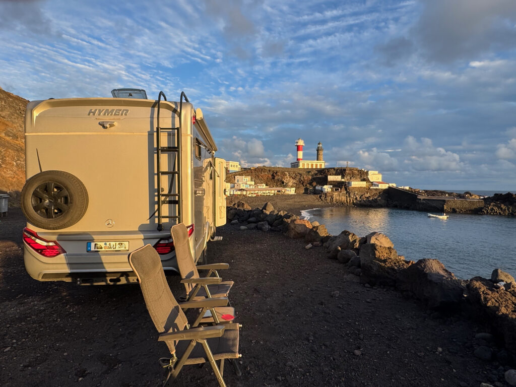 Wir übernachteten wieder an der Küste, diesmal in Puerto Naos, das nach dem Vulkanausbruch abgeschnitten war und lange Zeit wegen zu hoher CO2-Konzentration in der Luft zu einer Sperrzone gehörte. Mittlerweile ist jedoch alles wieder in Betrieb. Unser Stellplatz hier liegt neben dem Strand und in der Nähe der Restaurants und Cafés. Da La Palma ein beliebtes Ziel deutscher Touristen ist, gibt es in 100 Metern Entfernung eine deutsche Bäckerei, in der es neben Mohn- und Sesambrötchen auch Franzbrötchen gibt.
