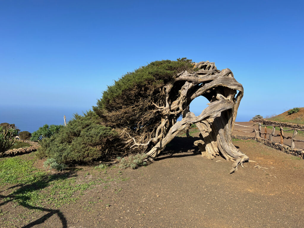 Nächstes Ziel war die langgezogene Bucht Las Playas an der Ostküste der Insel. Auf dem Weg dorthin besuchten wir das Wahrzeichen von El Hierro, die vom ständigen Wind gebeugten Wacholderbäume El Sabinar. Einer dieser Bäume befindet sich als Symbol auf vielen Produkten der Insel.